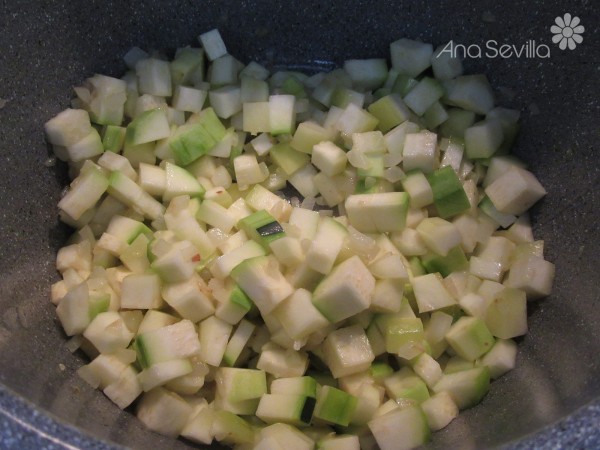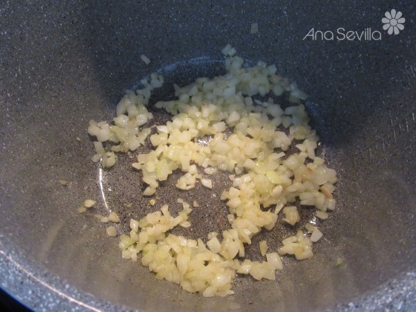 1- Picar la cebolla menuda y pochar en menú sofreír con un chorro de aceite unos 6 minutos.