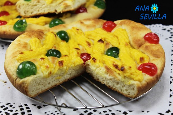 Coca de San Juan de crema. Auténtica coca para las hogueras de San Juan con crema pastelera ,frutas escarchadas, para una noche muy especial.