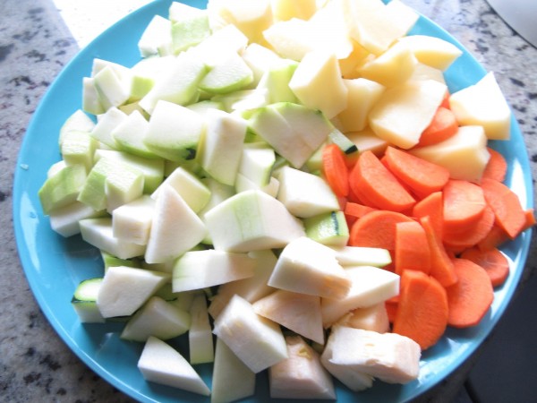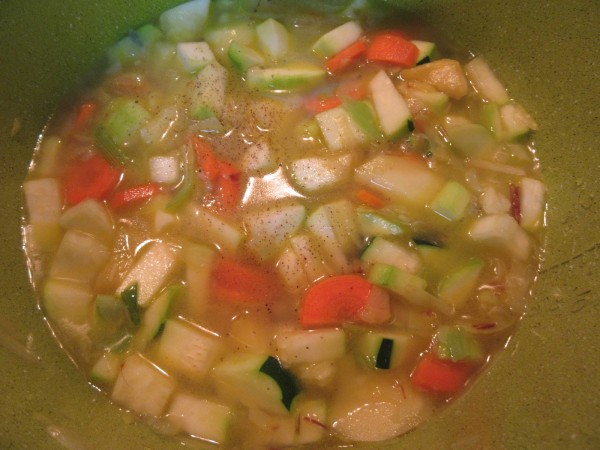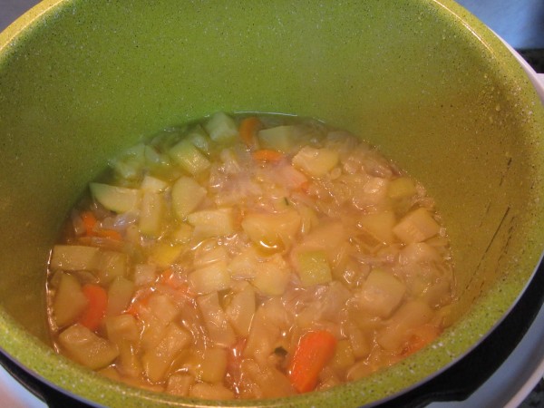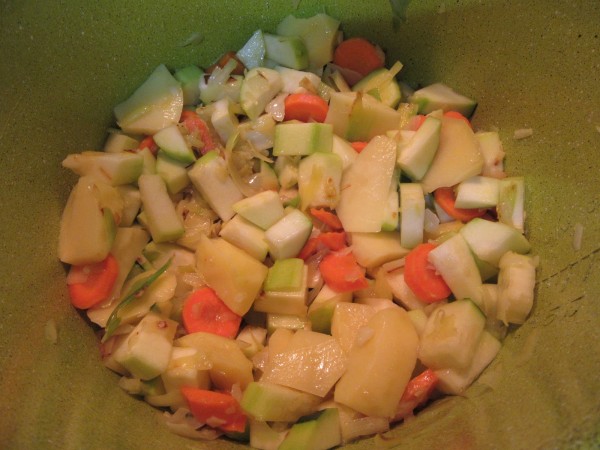 - Agregar el calabacín en trozos, zanahoria en rodajas y patatas chascadas en rodajas y sofreír un par de minutos. -