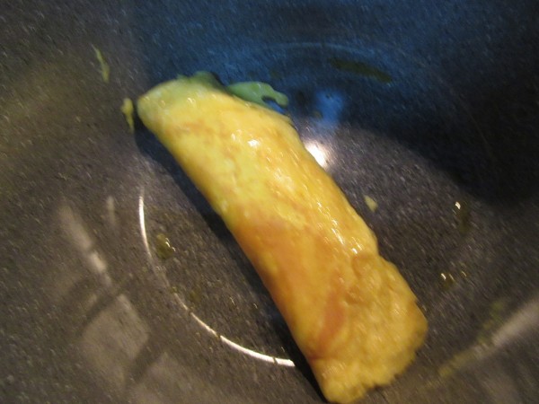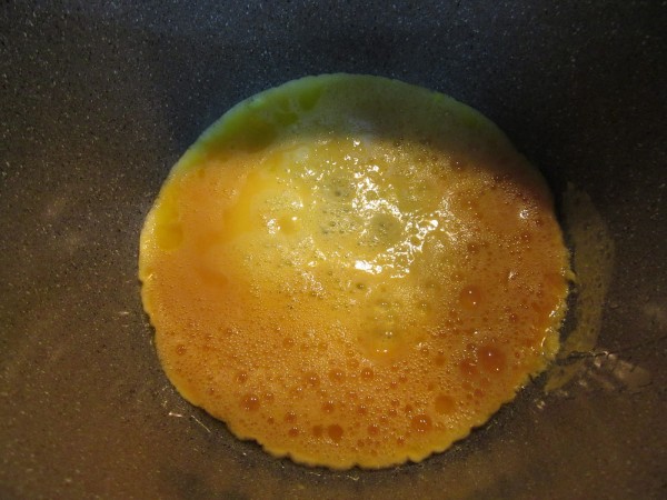 1- Hacemos la tortilla francesa con dos huevos cuajándola con un chorrito de aceite y sal, a 130º. Trocear y reservar.