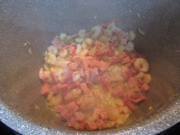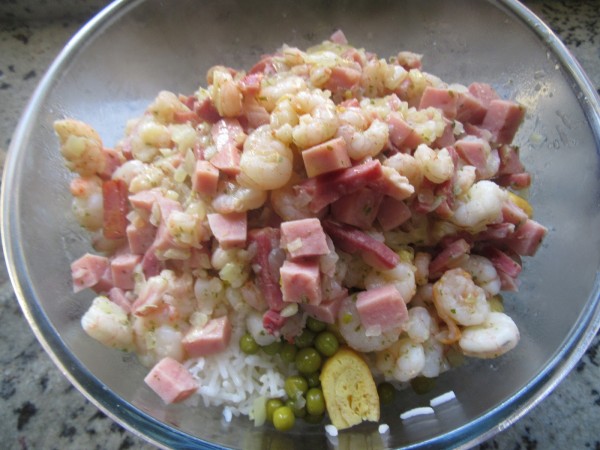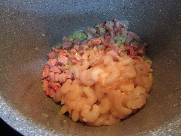 4- Agregar las gambas peladas, sofreír hasta que cambien de color. Y volcar sobre el arroz con los guisantes y la tortilla troceada.