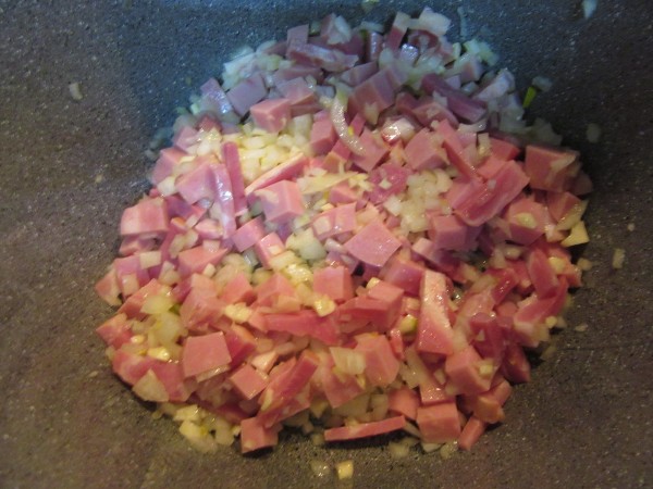 3- Picar la cebolla, ajos y perejil, menudos y pochar con el bacon y jamón cocido en dados, en menú freír con un poco de aceite.
