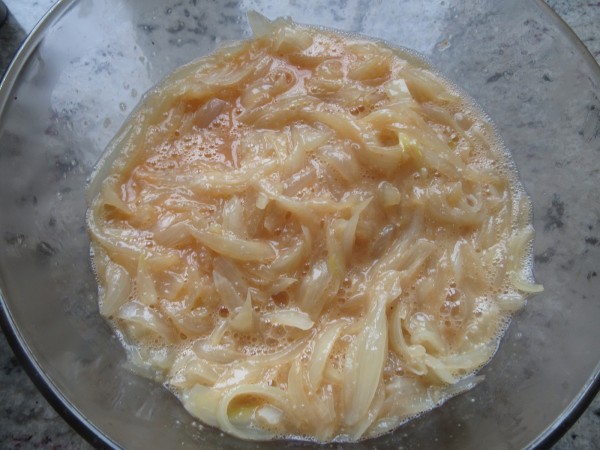 2- Batir los huevos con sal, pimienta y cebolla en polvo, añadir la cebolla pochada, mezclar bien.