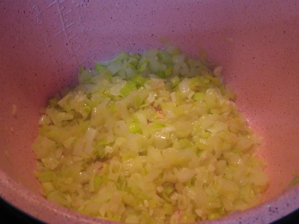 1- Picar la cebolla, puerro, ajos muy menudos y pochar con un poco de aceite en menú sofreír 8-10 minutos, hasta que esté blando.