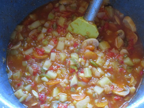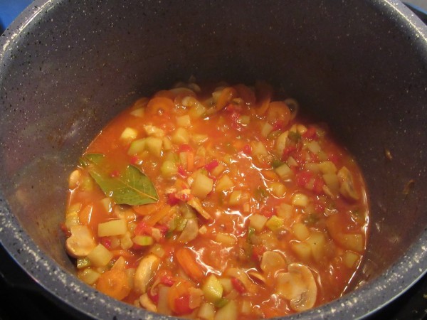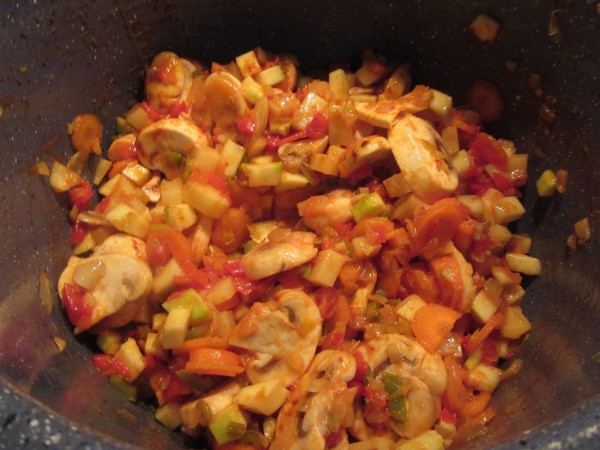 2- Añadir el tomate, calabacín, champiñones, zanahoria, patatas y pimentón, remover y , válvula cerrada, menú turbo, 5 minutos, 130º, media presión.