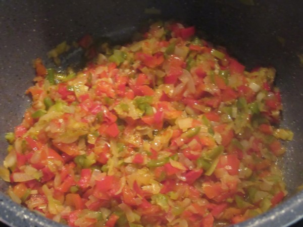 1- Pochar en menú freír sin tapa, con el aceite bien caliente, la cebolla, pimiento rojo y verde, ajos y puerro picaditos hasta que esté blando, unos 10-15 minutos.