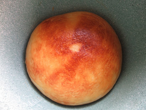 -Desgasificar amasando un poco para quitar el aire. Formar una bolla, aplastar con la palma de las manos y volver a fermentar 30 minutos.