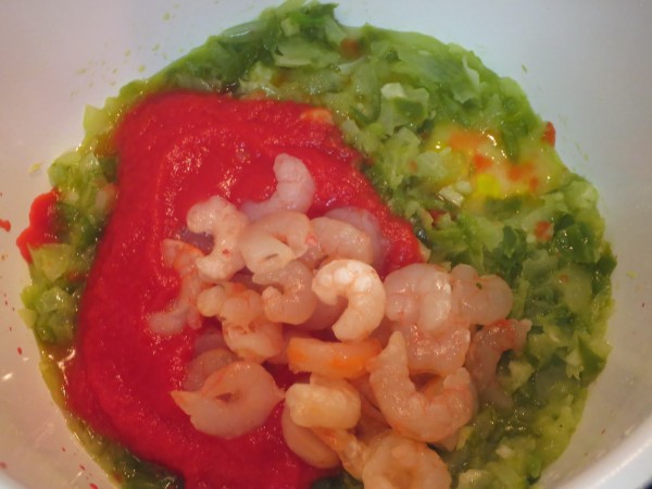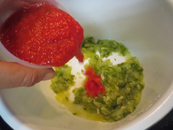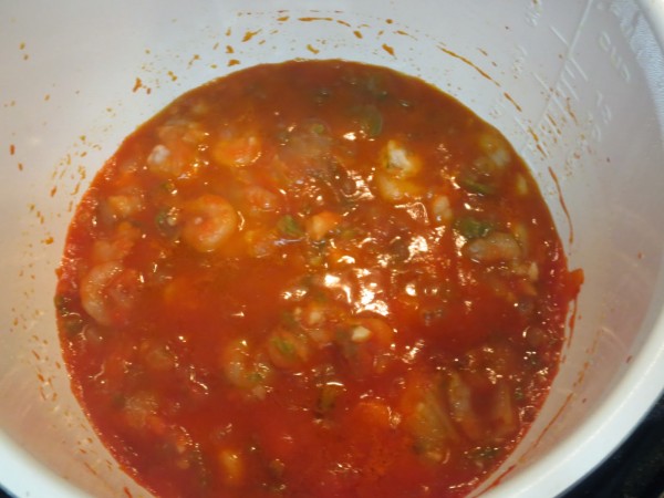 2- Añadir el tomate y las gambas peladas, remover bien, válvula cerrada, guiso, 4 minutos, 140º, media presión, despresurizar.