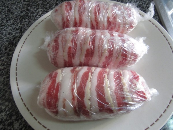 1- Hacer como un bolsillito en cada pechuga e introducir una cuña de queso. Salpimentar y envolver en la panceta y después hacer dos rollos con film, girando los extremos sobre la meseta. Reservar.