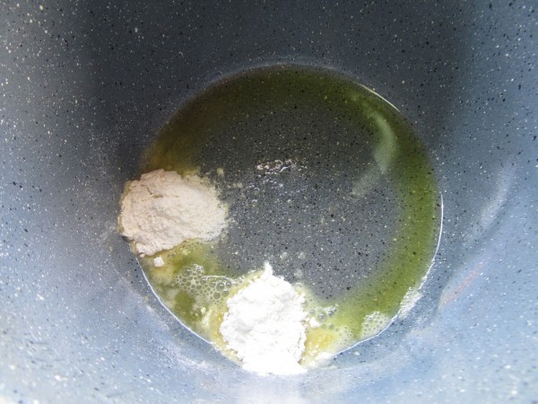 2- Calentar un poco de aceite en la cubeta, añadir la harina y sofreír 2 minutos removiendo.