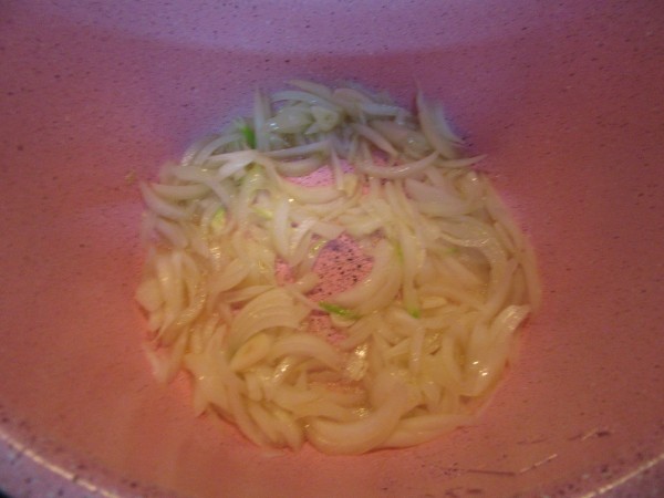 1- Pochar con un poco de aceite la cebolla cortada en pluma y el ajo en láminas, hasta que esté transparente, en menú sofreír.