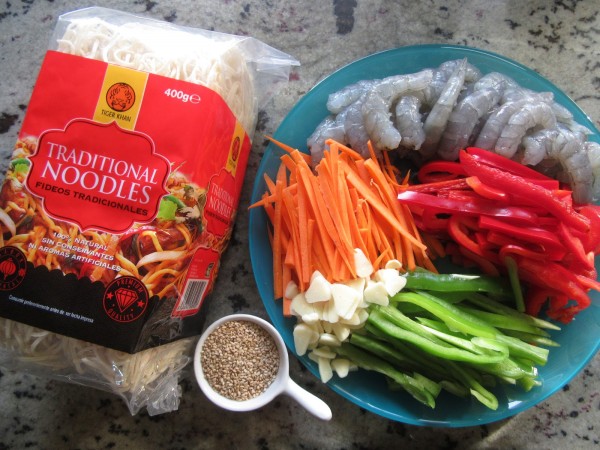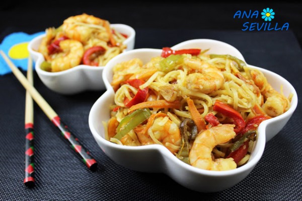 Noodles con verdura y langostinos. Fideos asiáticos que ahora están mucho de moda. Están muy ricos con mucha verdura y el toque de marisco.