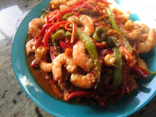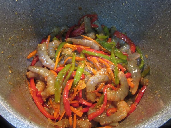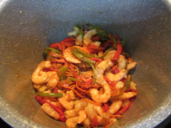 2- Añadir los langostinos, salsa de soja, cayena, y jengibre y pochar 2-3 minutos, hasta que los langostinos cambien de color. Reservar.