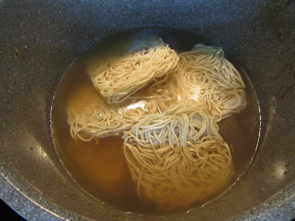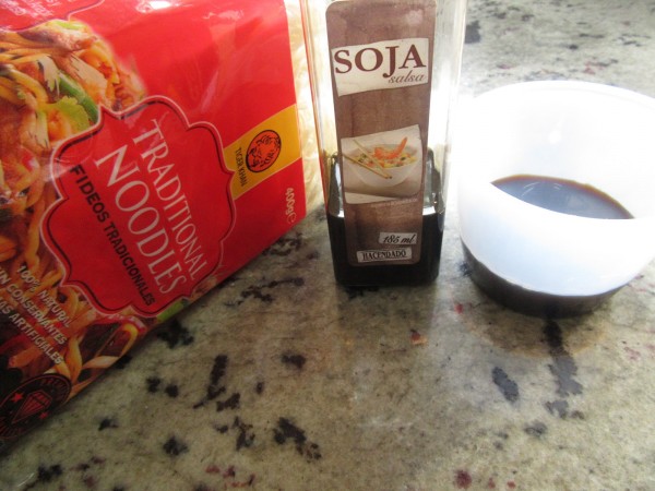 3- Sin lavar la cubeta echar 1 litro y medio de agua caliente, 1 cta. sal y noodles, remover y reposar con la tapa 5 minutos. Escurrir los noodles y sofreír dos minutos con el sofrito removiendo bien.