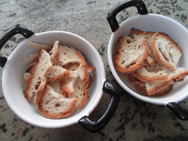 2- Agregar 20 gr. de pan y pimentón, y sofreír 1 minuto. El resto de pan repartirlo en 4 cazuelitas.
