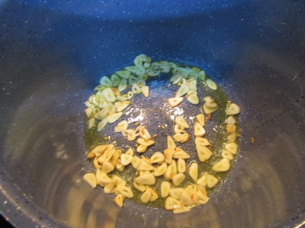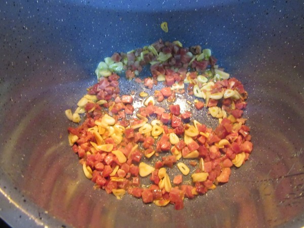 1- Sofreír los ajos en láminas con un chorro de aceite, y cuando quieran coger color, añadir el jamón picado, dar un par de vueltas.