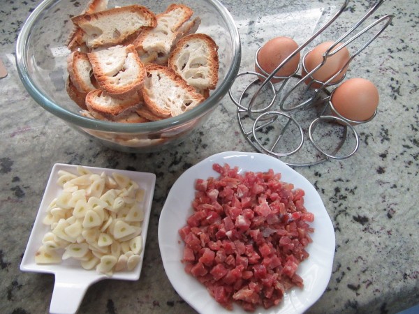 4- Abrir la olla, echar los huevos, remover bien y volcar sobre las cazuelitas y dejar reposar unos minutos, que engorde el pan y servir.