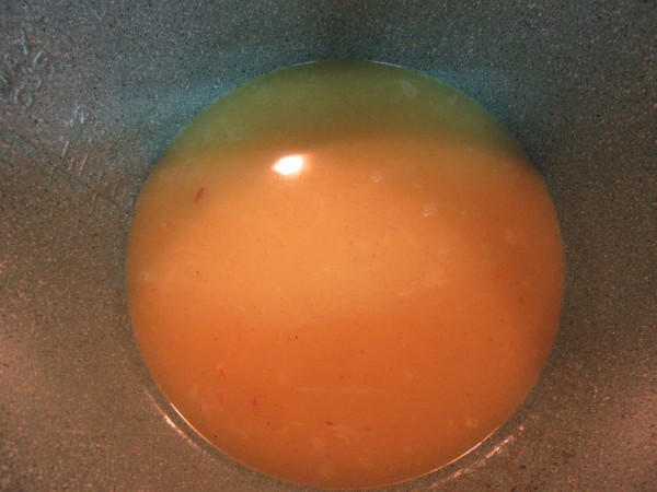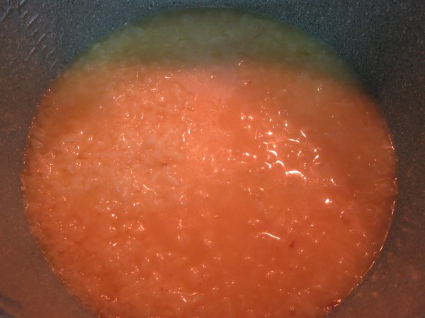 4- Añadir el caldo frío, azafrán y pimienta, remover bien: Válvula cerrada, menú vapor, 3 minutos, 130º, alta presión. Cancelar menú y reposar 5 minutos sin abrir la olla.