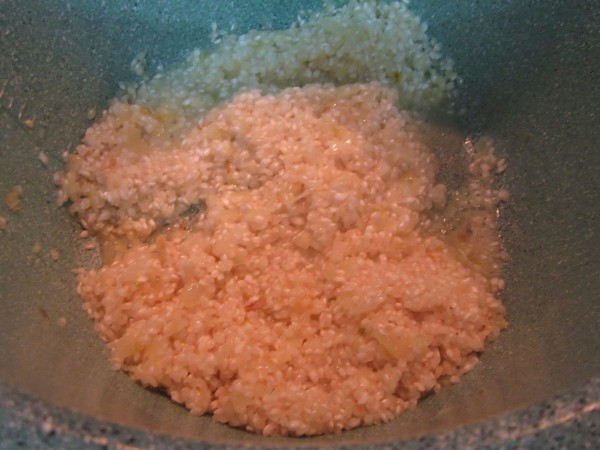 3- Agregar el arroz y vino blanco, sofreír 2-3 minutos removiendo.