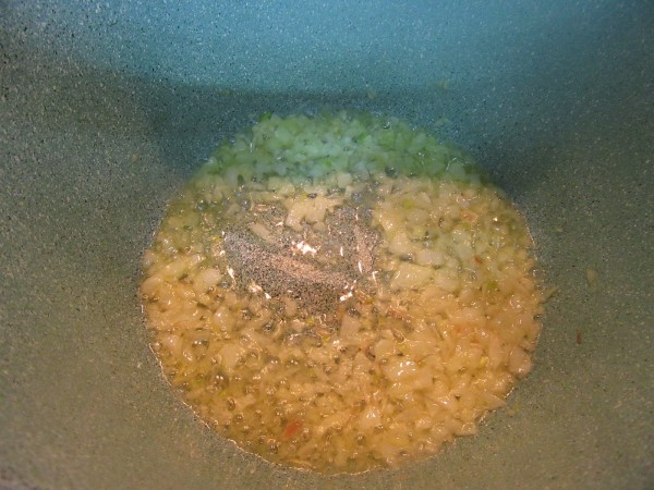 2- Picar la cebolleta muy menuda y sofreír hasta que esté blanda con la mantequilla.