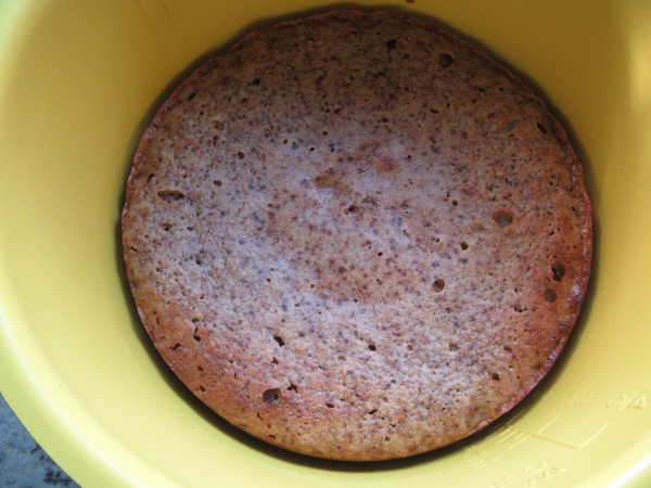 4- Volcar en un molde engrasado y enharinado, de unos 26 cm. hornear de 50 a 60 minutos a 180º. Dejar enfriar y desmoldar. -