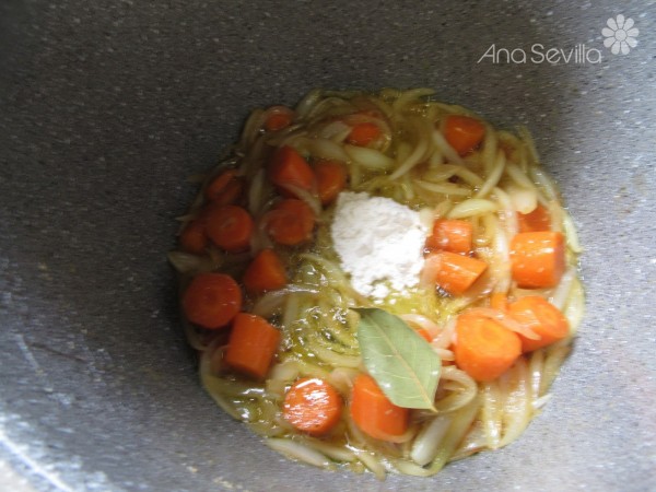 2- En ese mismo aceite, pochar la cebolla en juliana y la zanahoria en rodajas gruesas con un pizco de sal, remover, en freír hasta que la cebolla esté transparente.