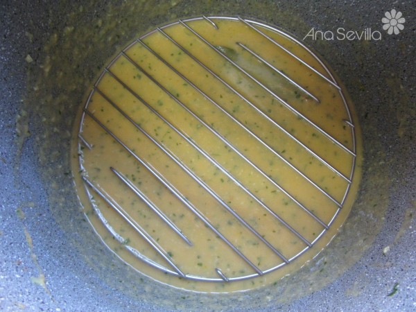 4- Cava, fumet, azafrán y la majada de ajo y perejil, dar un hervor y después triturar.