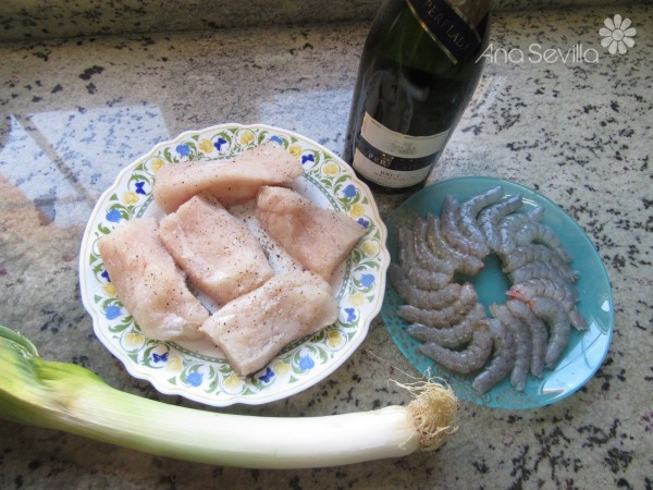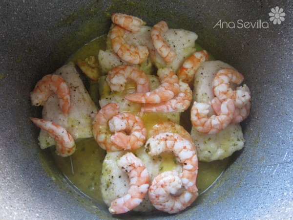 1- Salpimentar la merluza y los langostinos. Majar los ajos y perejil en el mortero. Reservar.