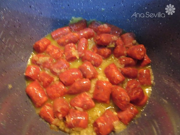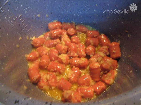 2- Agregar las salchichas en trozos y vino blanco, sofreír a 200º, 3-4 minutos destapado para favorecer la evaporación del alcohol.