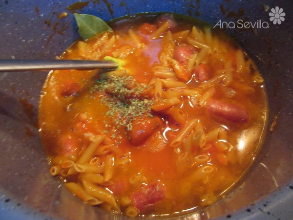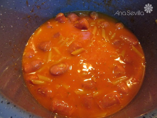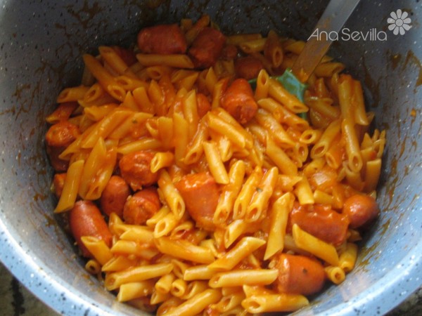 Macarrones con salchichas frescas y tomate frito. Plato de pasta completito, verdura, carne y pasta. ¿Qué más se puede pedir?