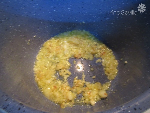 1- Picar menuda la cebolla y ajos y pochar con un poco de aceite 5 minutos en menú sofreír destapado, removiendo de vez en cuando.