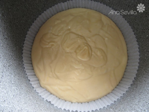 2- Introducir un molde desechable de 18 cm. en la cubeta o directamente en la cubeta forrada de papel de hornear o cubeta engrasada, volcar la mezcla y reposar 20 minutos.