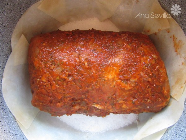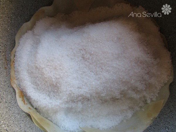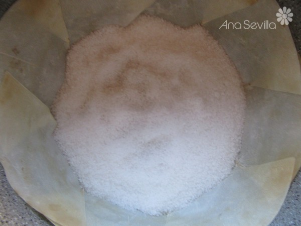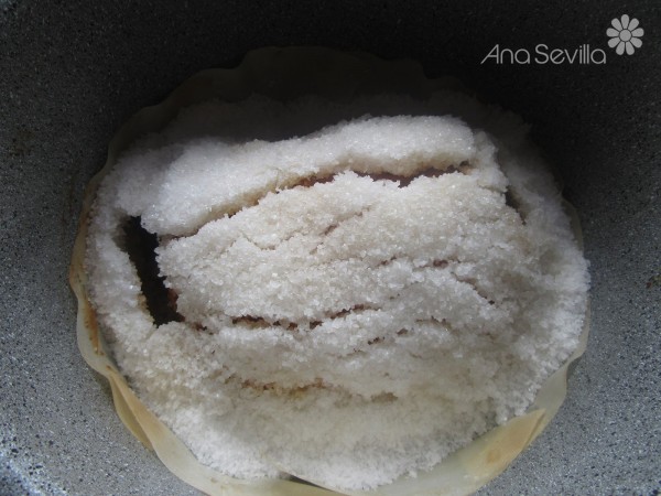 2- Cubrir el fondo de la cubeta con papel de hornear y encima una capa de 2 cm. de sal gorda en el fondo, colocar el lomo encima (Sin el film), y tapar con el resto de sal compactando bien con las manos, que quede totalmente cubierto. Salpicar con los dedos unas gotitas de agua.