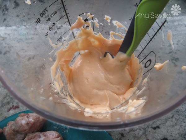 3- Hacemos la mayonesa: Ajos, huevo, aceite girasol y el restante de freír la carne, vinagre, pimentón y sal. Triturar sin levantar el brazo de la batidora, hasta que se una todo, subir y bajar el brazo poco a poco hasta que ligue.