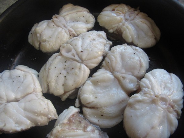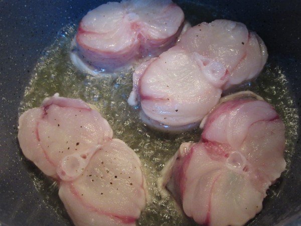 1- Cortar el rape en rodajas un poco gruesas, salpimentar y dorar con un poco de aceite, por ambos lados, Reservar el pescado en una cazuela.