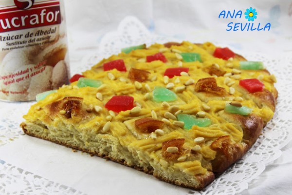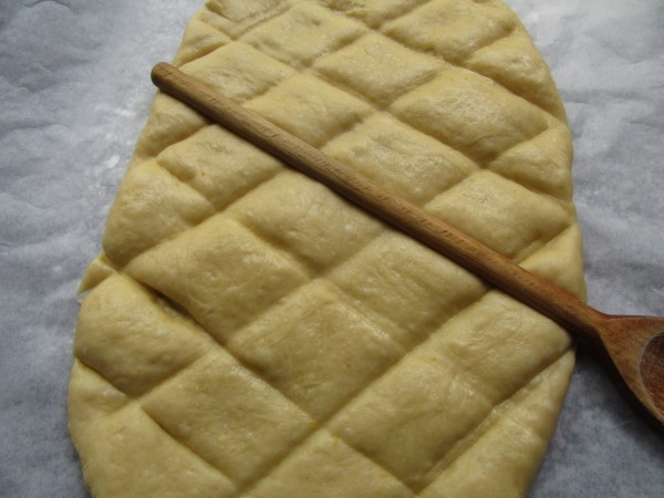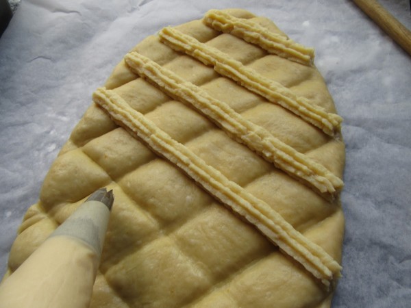5- Hacer surcos sobre la masa y poner tiras cruzadas de crema. Pincelar con huevo. Adornar. Tapar y dejar levar mientras precalentamos el horno a 190º unos 20 minutos.