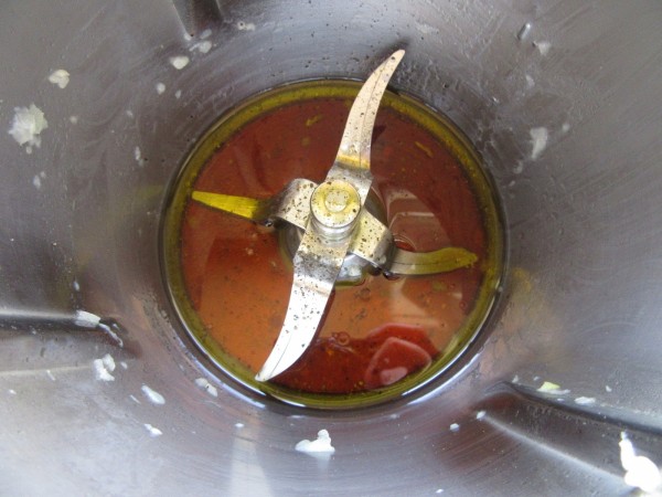 4- Sin lavar el vaso, hacemos la vinagreta: aceite, vinagre, soja y pimienta (Yo no pongo nada de sal, con la soja es suficiente) y emulsionar 10 seg. vel.4.