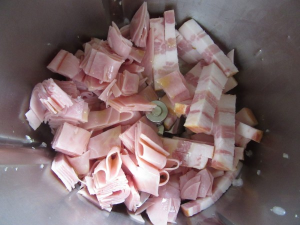 2- Aclarar y secar un poco el vaso, cebolla y ajos,, 2 seg. vel.5. Bajar restos hacia las cuchillas y añadir 30 gr. aceite, bacon y jamón cocido, sofreír el conjunto 9 min. Varoma, giro izda, vel. cuchara.