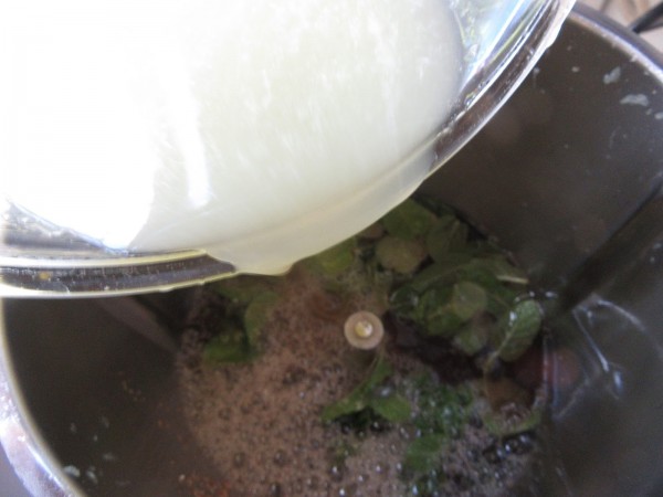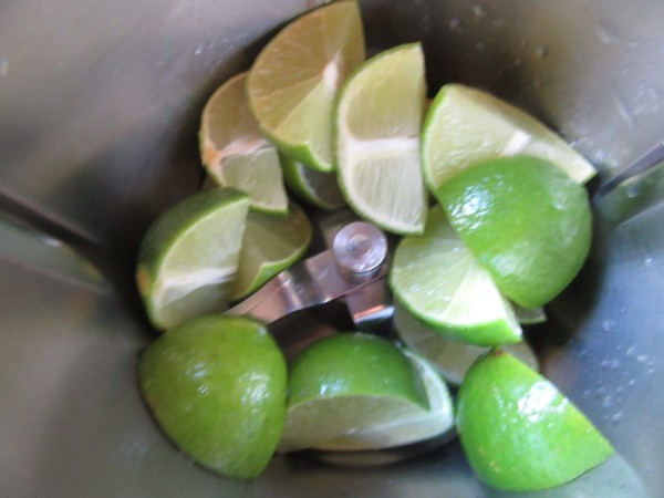 1- Echar las limas en el vaso, bien lavadas y troceadas en 4 trozos.Pulsar 3 ó 4 golpes de turbo. Colar con el cestillo, aclarar el vaso con agua y devolver al vaso el líquido obtenido.