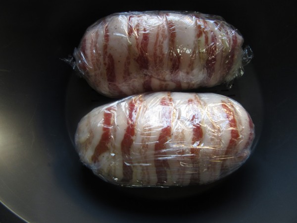 1- Hacer como un bolsillito en cada pechuga e introducir una cuña de queso. Salpimentar y envolver en la panceta y después hacer dos rollos con film, girando los extremos sobre la meseta. Colocar en el fondo del varoma.