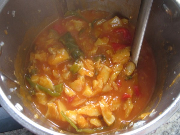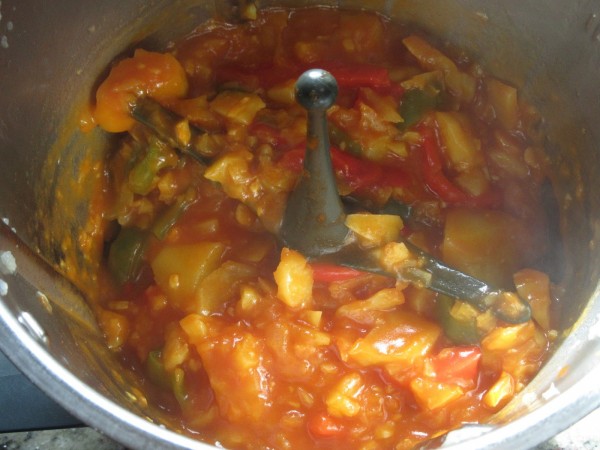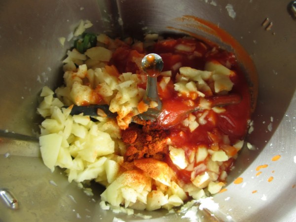 4- Agregar la patata picada, tomate frito, pimentón y cayena o guindilla, 10 min. 100º, vel. cuchara.