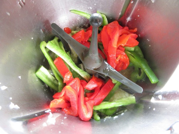3- Colocar la mariposa, pimiento verde en tiras (Podéis picarlo mas pequeño a gustos) y pimiento asado, 5 min. Varoma vel. cuchara.