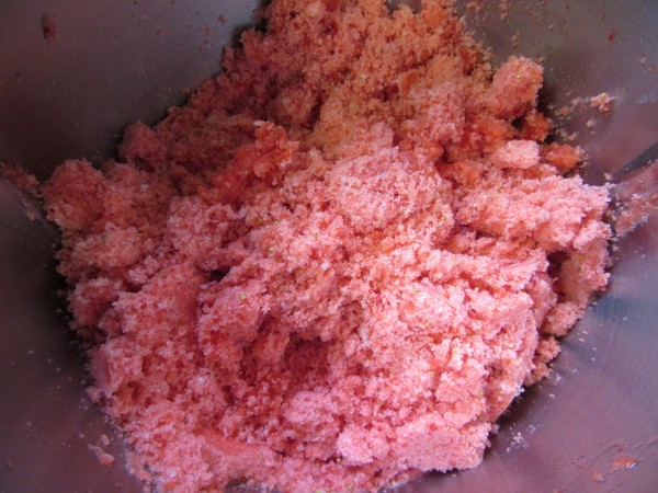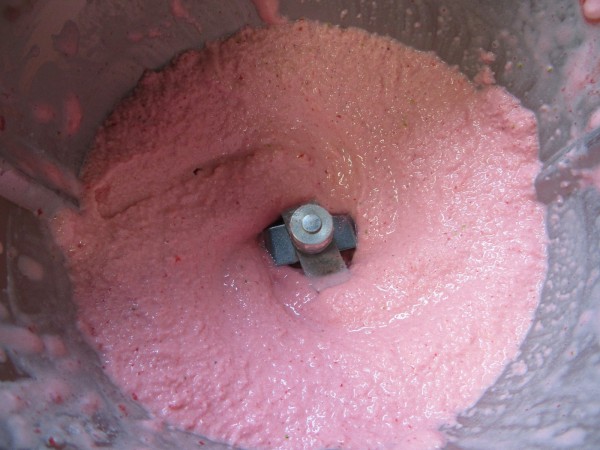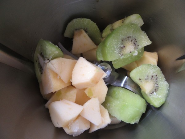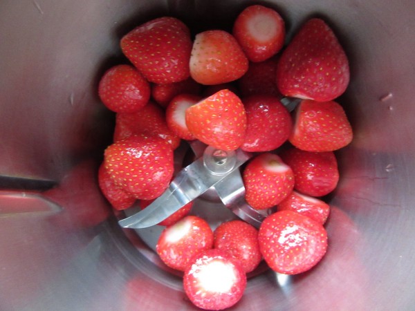 1- Triturar la fruta con el azúcar, 20 seg. vel.10. Bajar restos paredes y tapa.