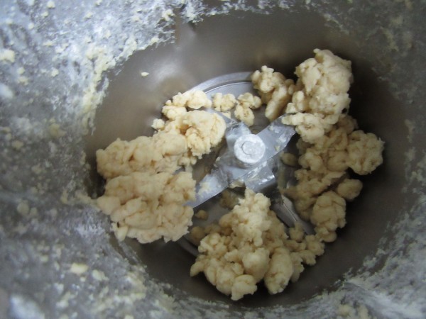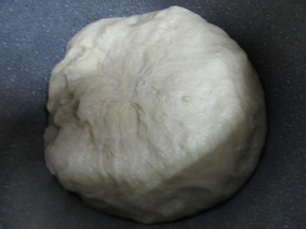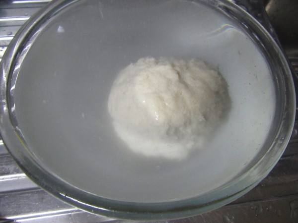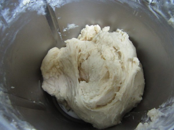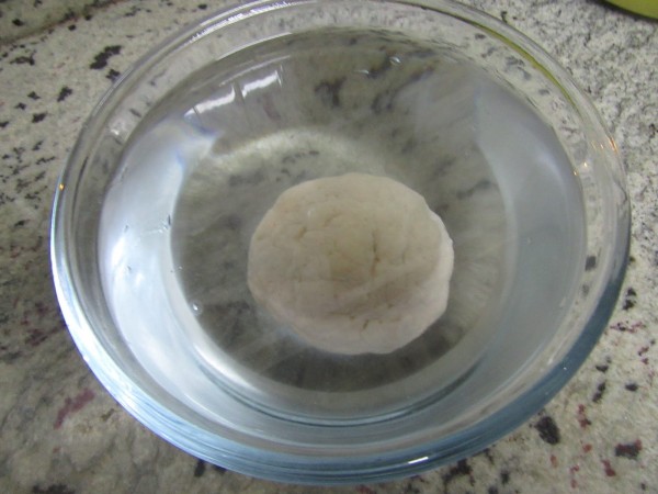 3- Agregar la harina, 1 min. Espiga. Apretar la masa y formar una bola. Introducir en un bol amplio lleno de agua caliente (No quemando), hasta que flote, tardará unos 10 minutos, mientras vamos haciendo el resto de la masa.
