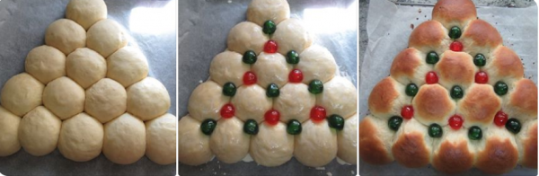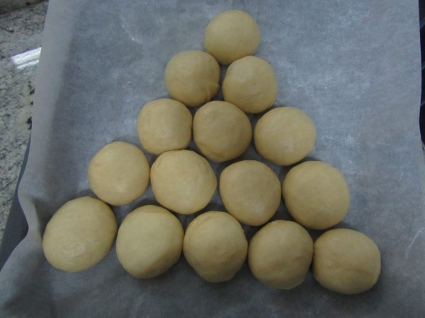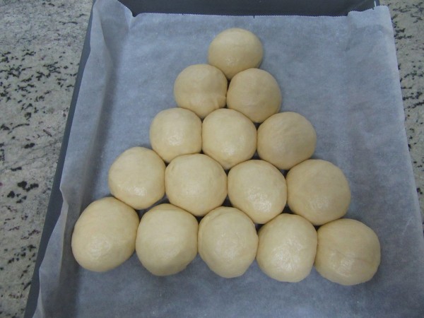 4- Amasar un poco, sólo un poquito, para quitar el aire y dividir en 15 bolas de unos 75 gr cada una.(Podéis engrasaros las manos con aceite, así no se pega), colocarlas en la bandeja del horno en forma de árbol, separadas un poquito entre sí. Tapar y dejar levar de nuevo sobre hora y media dos horas, hasta que doblen volumen.