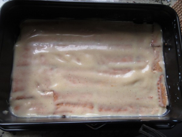 4- Con las 3 preparaciones hechas, montar la tarta. (Molde 28x18, o redondo de unos 23 cm. ó cuadrado 24x24 cm.). Ir remojando las galletas en la leche, tapando agujeros con trozos.