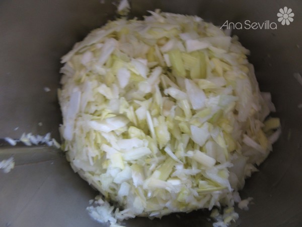 1- Picar el puerro en trozos, ajos y cebolla, 4 seg. vel.4. Añadir el aceite, 15 min., Varoma, giro izda, vel. cuchara. Sin cubilete, colocar el cestillo en su lugar.