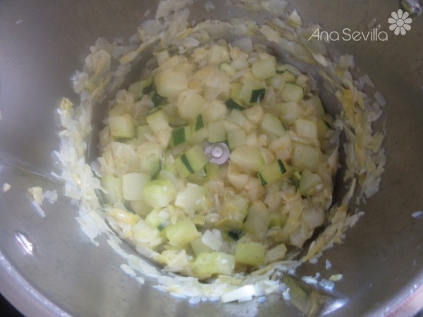 2- Agregar el calabacín en dados, sal y pimienta, 8 min., Varoma, giro izda, vel., cuchara. Sin cubilete. Reservar en un bol.