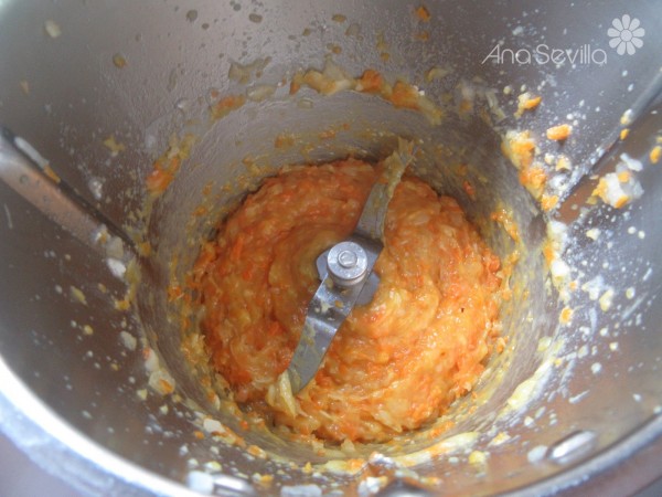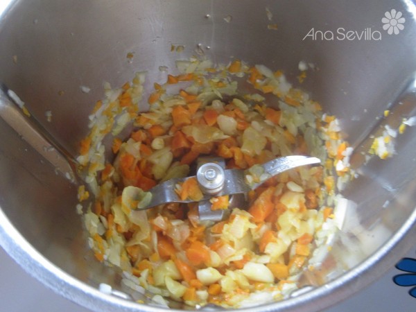 2- Picar la cebolleta, ajo y zanahoria, 6 seg. vel. 4. Bajar restos hacia las cuchillas, añadir 30 gr. de aceite, 10 min., Varoma, vel. cuchara, sin cubilete.