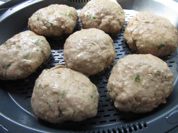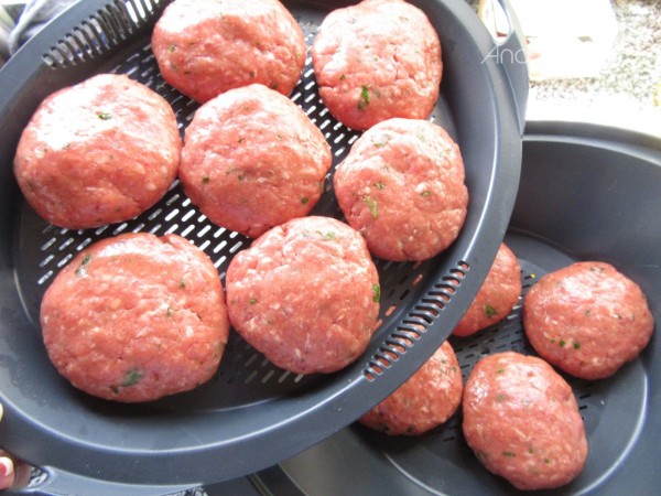 1- Adobar la carne con los huevos, 2 ctas. pequeñas sal, pimientas, ajo en polvo, cebolla en polvo y perejil. Formar unas 10 bolas de unos 100 gr. cada una con las manos engrasadas con aceite, aplastar e ir colocando fondo y recipiente del varoma.. Reservar.